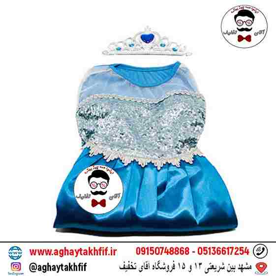 این لباس با الهام از شخصیت “السا” از انیمیشن معروف فروزن (Frozen) طراحی شده و با رنگهای جذاب آبی یخی، سفید نقرهای و جزئیات درخشان، حس واقعی یک پرنسس یخی را به کودک منتقل میکند.